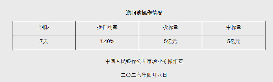 4月8日电 据央止网站新闻,2026年4月8日中原群众银止以牢固利率、数目投标体例启铺了5亿元7天期顺归买操纵,齐额知足了1级来往商需要。详细环境以下: